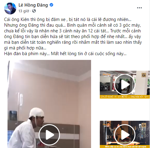 "Cái ông Kiên thì ông bị đâm xe, bị tát nó là cái lẽ đương nhiên... Nhưng ông Đăng thì đau quá. Bình quân mỗi cảnh sẽ có 3 góc máy, chưa kể lỗi vậy là nhân nhẹ 3 cảnh này ăn 12 cái tát. Trước mỗi cảnh ông Đăng tin bạn diễn hứa sẽ tát theo phối hợp để nhẹ nhất... ấy vậy mà bạn diễn tát toàn nghiến răng rồi nhắm mắt thì làm sao nhìn thấy gì mà phối hợp nữa. Hận đàn bà phim này... Mất hết lòng tin ở cái cuộc sống này...", Hồng Đăng chia sẻ trên trang cá nhân sau khi tập 39 Hướng dương ngược nắng phát sóng.
