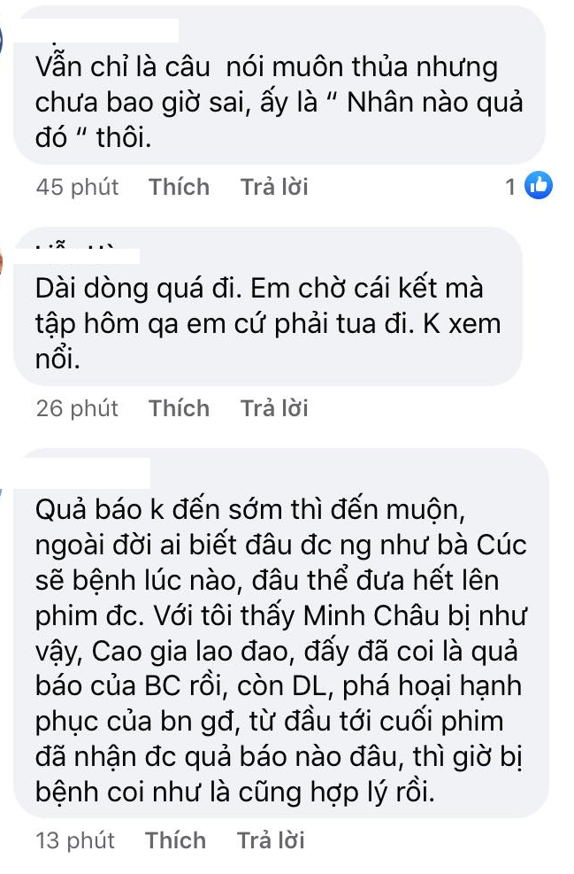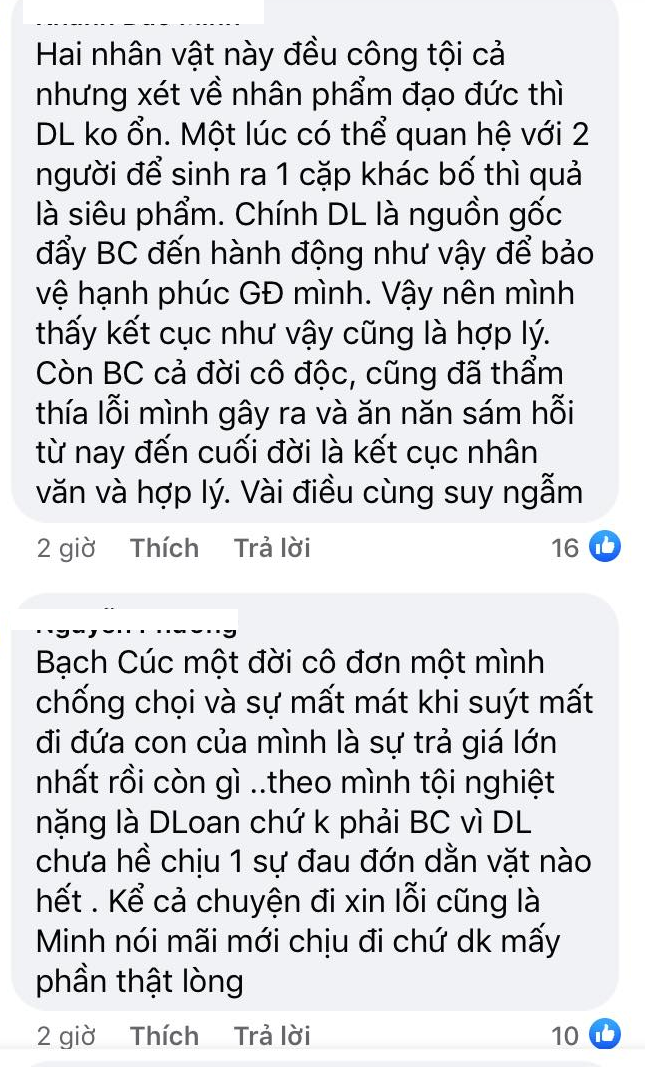 Một số khán giả cho rằng không nên coi ung thư là quả báo, bởi có nhiều người tốt, thậm chí vừa sinh ra đã mắc căn bệnh này. Số khác cho rằng nếu cái chết là kết cục của 'tiểu tam' thì Bạch Cúc cũng cần phải trả giá, không xứng đang được hưởng hạnh phúc trọn vẹn sau tất cả.