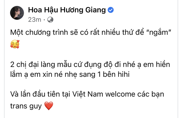 Trước thông tin về "bộ sậu đỉnh của chóp", netizen để lại nhiều bình luận nể phục Hương Giang vì có thể mời được 2 siêu mẫu đình đám của làng mẫu Việt. Bên cạnh đó, không ít người cho rằng Hương Giang khi "ngồi chung mâm" cùng Hà Anh - Xuân Lan xem ra vẫn có sự khập khiễng nhất định. Thậm chí, ngay trong bài đăng của mình, Hương Giang cũng chia sẻ: "2 chị đại của làng mẫu cứ đụng độ đi nhé ạ, em hiền lắm, em xin né nhẹ sang một bên".