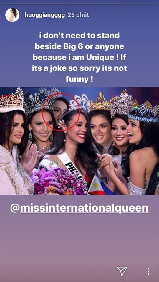 Cô viết: "I don't need to stand beside Big6 or anyone. Because I am unique! If its a joke so sorry its not funny!" (Tạm dịch: "Tôi không cần phải đứng cạnh Big 6 (6 hoa hậu có vị thế danh hiệu lớn nhất) hay bất cứ ai vì tôi là duy nhất! Nếu nó là một trò đùa, rất xin lỗi nó không hề buồn cười!")