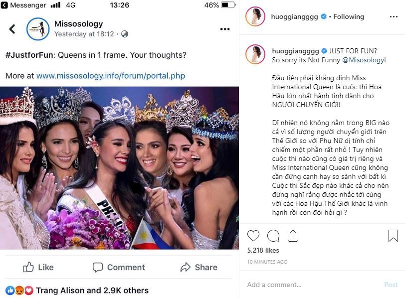Không dừng lại ở đó, Hoa hậu Chuyển giới Quốc tế 2018 còn bày tỏ suy nghĩ của mình tag thẳng tài khoản Instagram của chuyên trang sắc đẹp này: