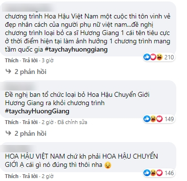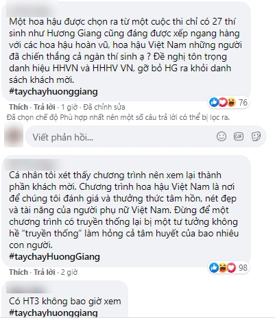 Mặc dù chỉ góp mặt với vai trò ca sĩ biểu diễn tại Hoa hậu Việt Nam 2020, tuy nhiên antifan vẫn không chấp nhận điều này. Nhiều người cho rằng với một nghệ sĩ đang bị scandal thì việc xuất hiện trong một chương trình lâu đời, tôn vinh nhan sắc phụ nữ Việt sẽ ảnh hưởng rất nhiều. Bên dưới các bài đăng, hashtag #taychayhuonggiang tiếp tục "phủ sóng", cho thấy làn sóng phẫn nộ của antifan đối với Hương Giang bất chấp nàng Hậu đã tuyên bố sẽ khởi kiện.