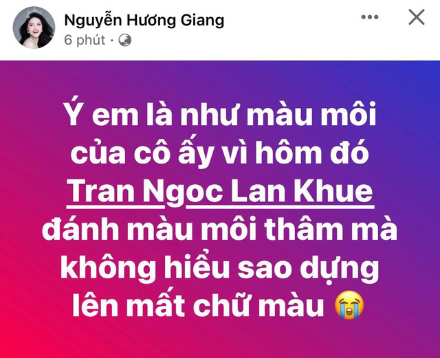 Sau khi phát ngôn của Hương Giang viral khắp các diễn đàn sắc đẹp, chính chủ đã phải đính chính trên trang cá nhân: "Ý em là 'như màu môi của cô ấy' vì hôm đó Lan Khuê đánh màu môi thâm mà không hiểu sao dựng lên mất chữ màu".