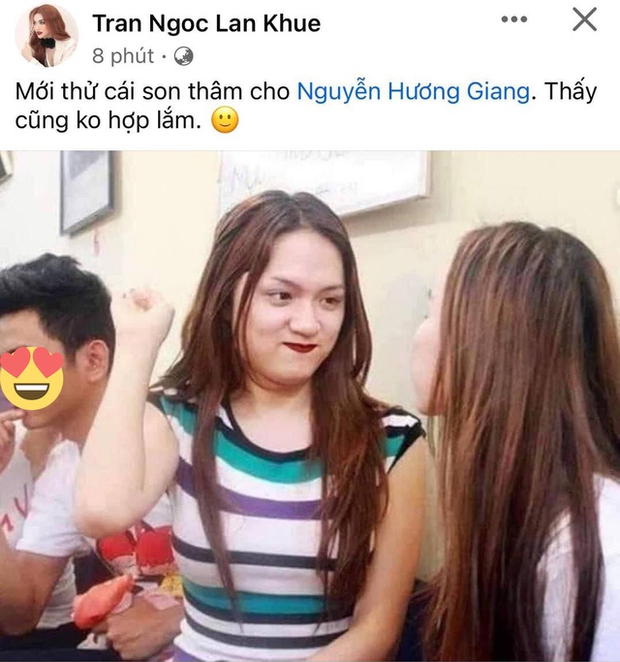 Sau khi phát ngôn của Hương Giang viral khắp các diễn đàn sắc đẹp, chính chủ đã phải đính chính trên trang cá nhân: "Ý em là 'như màu môi của cô ấy' vì hôm đó Lan Khuê đánh màu môi thâm mà không hiểu sao dựng lên mất chữ màu". Trong khi đó, Lan Khuê còn đăng hẳn ảnh thời xưa của Hương Giang: "Mới thử cái son thâm cho Hương Giang. Thấy cũng không hợp lắm".