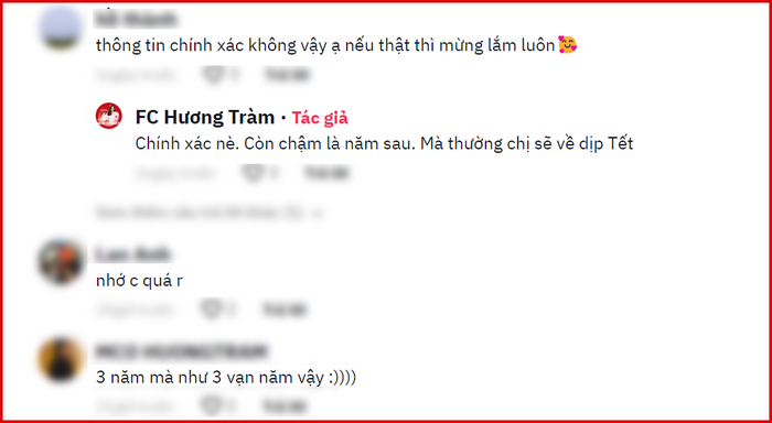 Bên dưới đoạn clip, phía FC Hương Tràm cũng đã có phản hồi giải đáp một dân mạng muốn xác nhận thông tin: "Chính xác nè. Còn chậm là năm sau. Mà thường chị sẽ về dịp Tết".