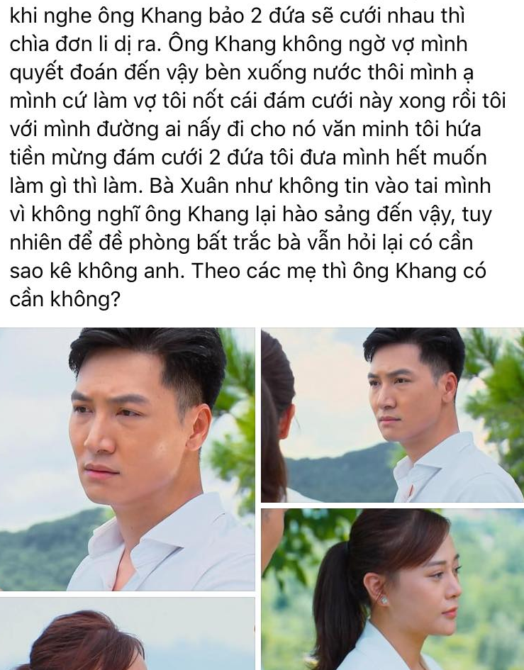 Mới đây, một thành viên trong ekip đã hé lộ tình tiết tiếp theo. Theo đó, ông Khang đồng ý nhưng khuyên vợ hãy lo nốt cho đám cưới Long - Nam rồi đường ai nấy đi.