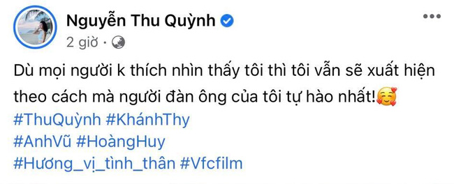 Tối qua, khi tập 42 của Hương vị tình thân lên sóng, diễn viên Thu Quỳnh cũng đồng thời đăng đàn bày tỏ cảm xúc của mình. Cô đăng ảnh chụp cùng diễn viên Hoàng Anh Vũ (vai Huy) với dòng caption: "Dù mọi người không thích nhìn thấy tôi thì tôi vẫn sẽ xuất hiện theo cách mà người đàn ông của tôi tự hào nhất!".