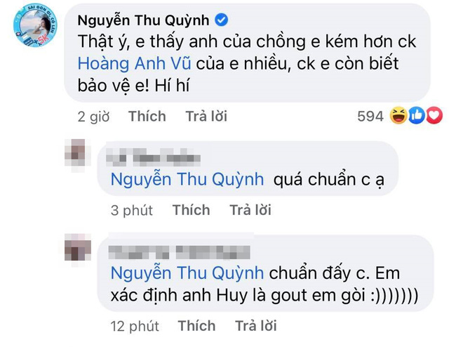 Trong một bài viết của thành viên ê kíp Hương vị tình thân nói về nhân vật Long, "Khánh Thy" Thu Quỳnh cũng vào bình luận. Nữ diễn viên lên tiếng thay cho nhân vật Thy: 'Thật ý, em thấy anh của chồng em kém hơn chồng của em nhiều. Chồng em còn biết bảo vệ em!'