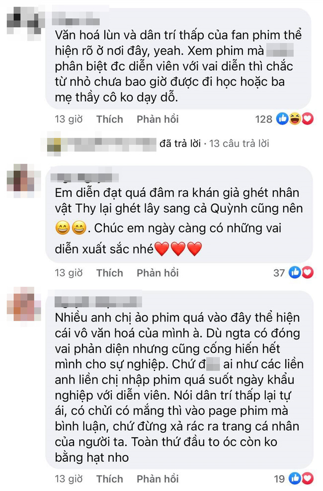 Đây không phải là lần đầu tiên Thu Quỳnh bị fan quá khích xúc phạm trên MXH. Giai đoạn đầu khi phim lên sóng, nữ diễn viên từng thừa nhận có thời điểm mình bị tổn thương vì những lời bình phẩm trên MXH, nhưng dần dần, cô cũng tập làm quen với việc này.