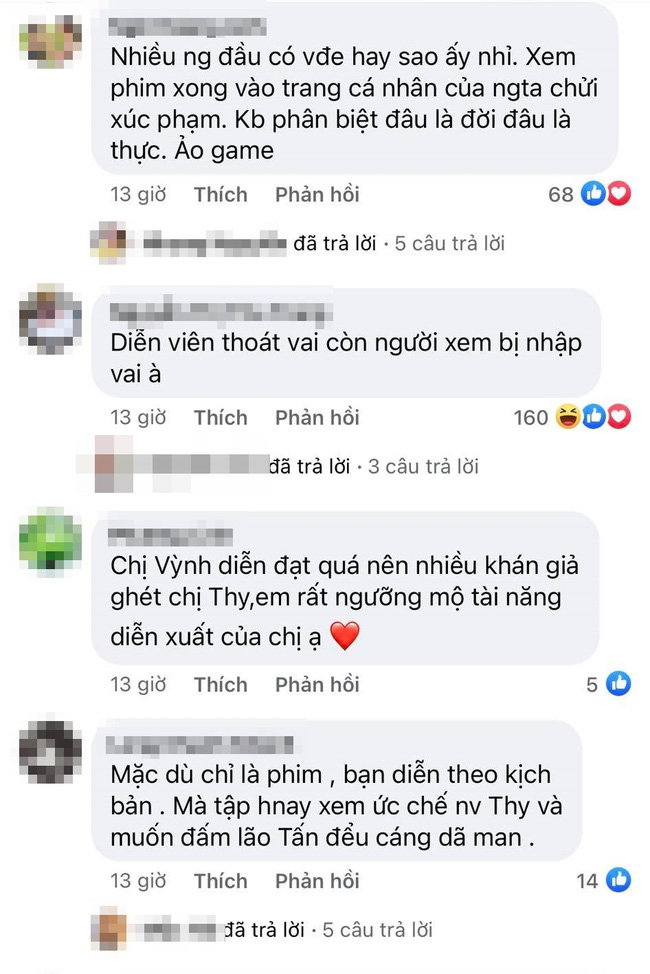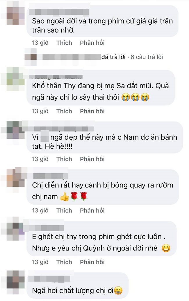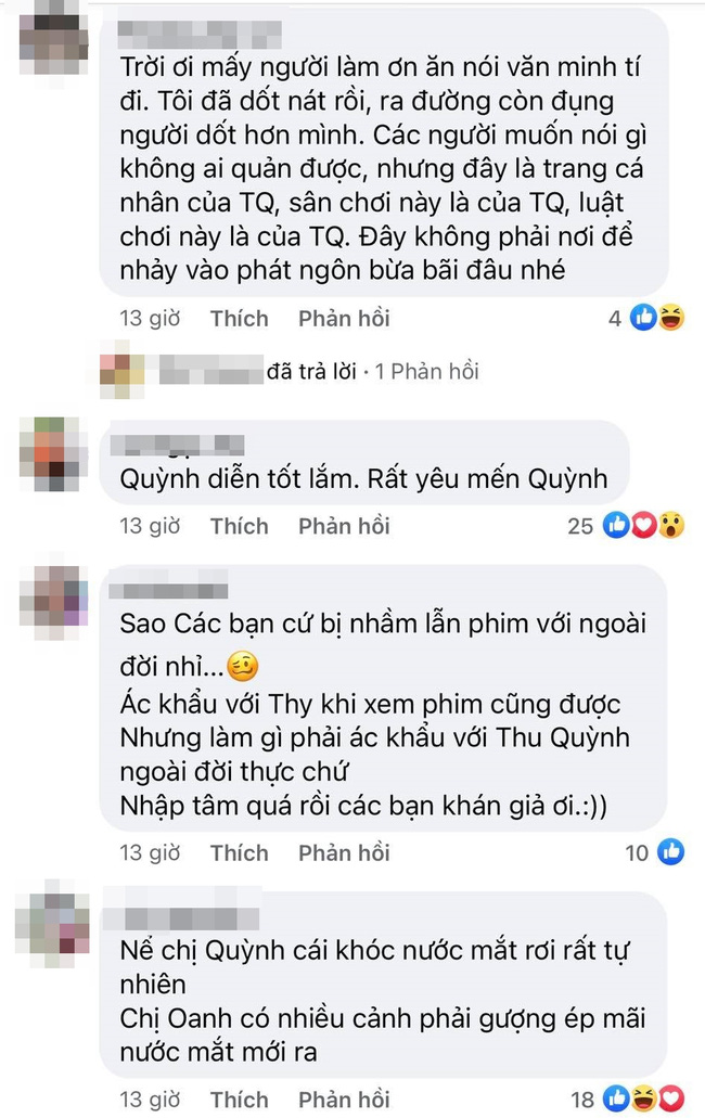 Hiện tại, bình luận này thu hút tới hơn 700 lượt "haha" và hơn 300 lượt phẫn nộ của khán giả. Dù bản thân bị chửi bới nhưng Thu Quỳnh không hề có động thái căng thẳng mà chỉ nhẹ nhàng... cảm ơn vị khán giả nọ: "Cảm ơn bạn đã rất nhập tâm khi xem phim của chúng mình". Bình luận đáp trả của nữ diễn viên thu hút hơn 2.000 like, đồng thời được nhiều khán giả khen ngợi là văn minh, tinh tế.