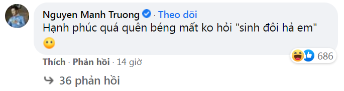 Dưới bài đăng của thành viên ekip, "shark Long" Mạnh Trường để lại bình luận hài hước: 'Hạnh phúc qua quên béng mất không hỏi 'Sinh đôi hả em'.