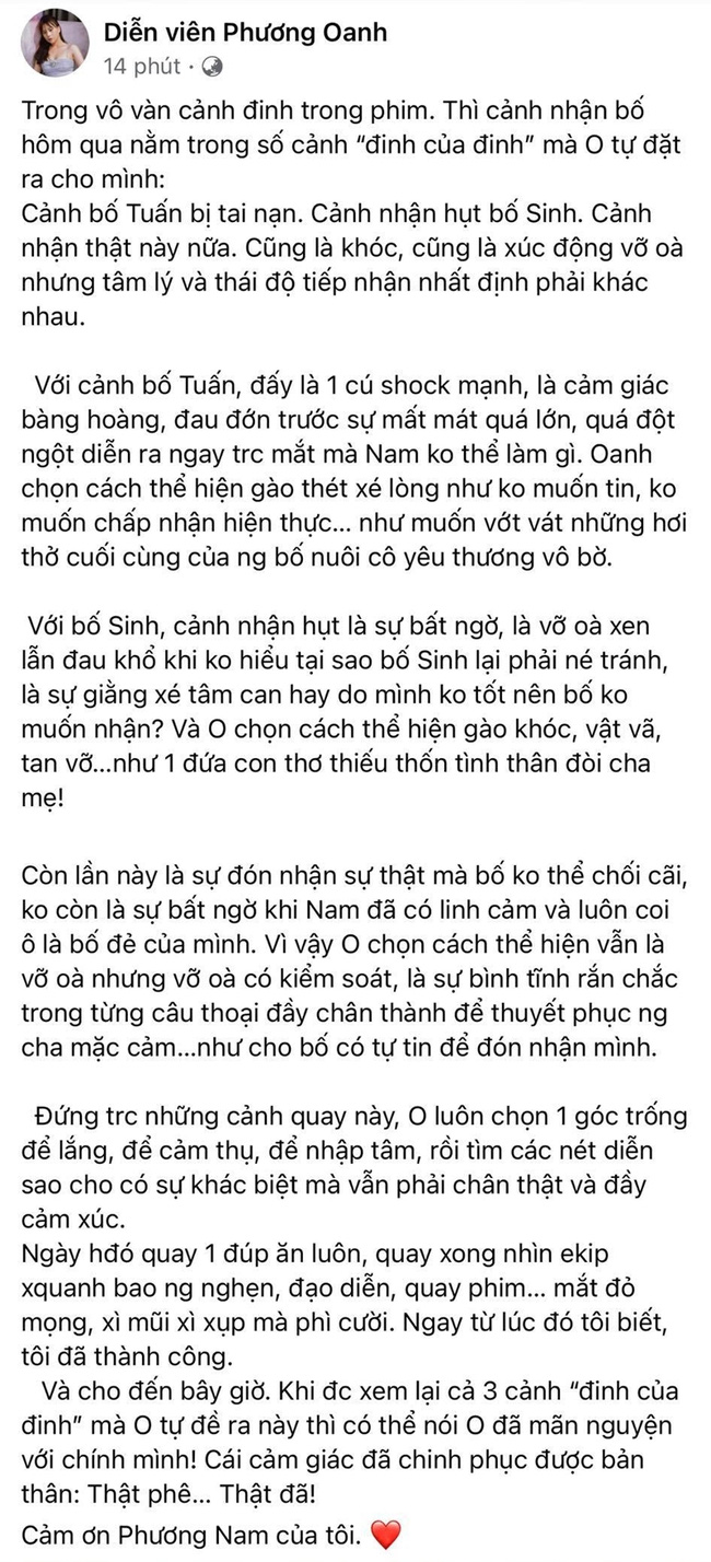 Mới đây, trên fanpage chính thức, diễn viên Phương Oanh đã đăng đàn tâm sự về 3 cảnh khóc đinh của cô trong phim. Yếu tố "đinh" ở đây là do Phương Oanh tự đặt ra cho bản thân mình. Đó là cảnh khóc khi bố Tuấn gặp tai nạn, cảnh khóc lúc nhận hụt ông Sinh làm bố và cảnh phim tối qua, khi hai bố con chính thức nhận nhau.