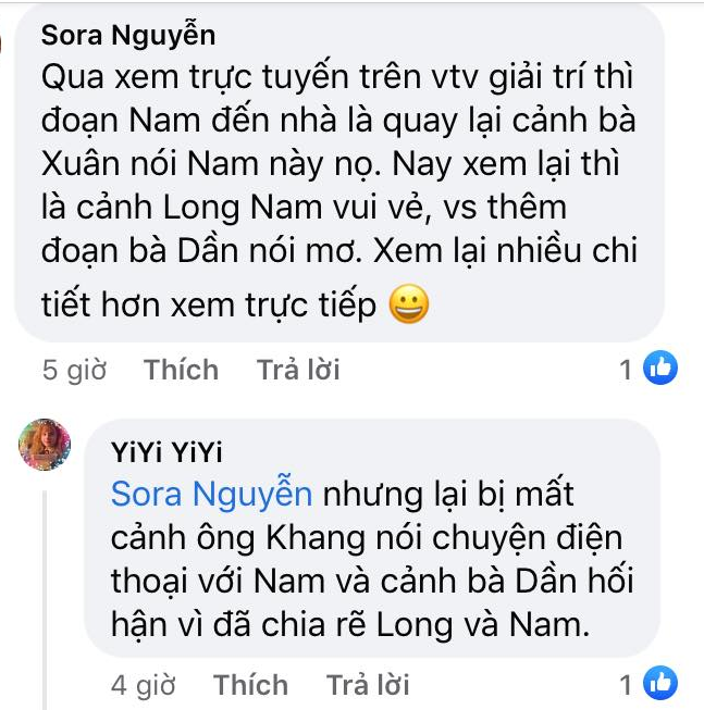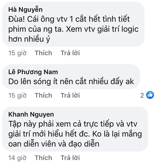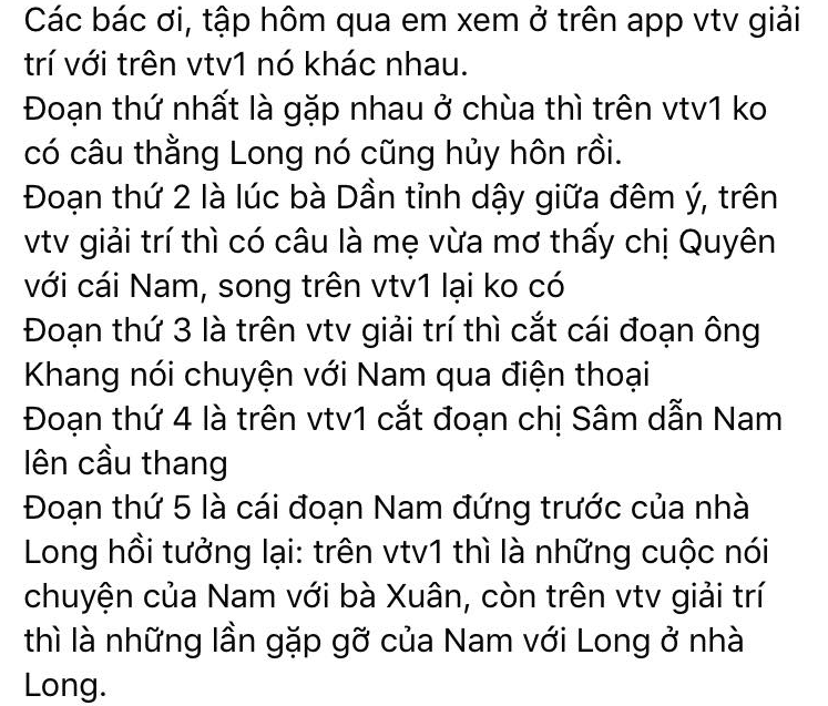 Theo đó, khán giả phát hiện ra những điểm khác biệt như ở cảnh Nam hồi tưởng lúc đi chùa với bà và ông Khang. Trong bản chiếu trên VTV1, bà Dần nói với Nam: "Thôi chuyện cũ bỏ qua đi, không việc gì phải ngại cả!". Còn trong bản chiếu trên VTV Giải Trí, câu nói của bà Dần là: "Thôi chuyện cũ bỏ qua đi, thằng Long nó cũng hủy hôn rồi, không việc gì phải ngại cả!". Như vậy, với bản chiếu trên VTV Giải trí, Nam đã biết được chuyện Long hủy hôn, chia tay Thiên Nga.