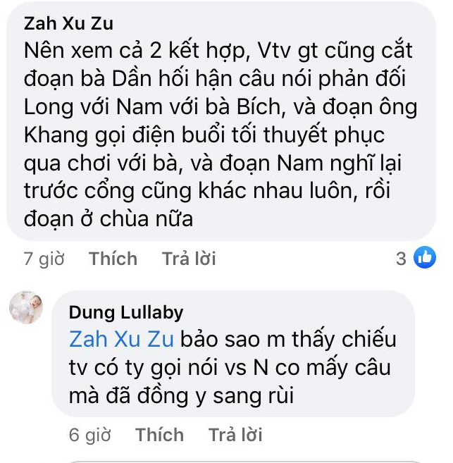 Trong khi đó, ở bản chiếu trên VTV Giải trí, câu nói của ông Khang bị cắt hoàn toàn, chỉ còn cảnh Nam cầm điện thoại lên nghe và nói: "Vâng ạ, cháu chào bác!".