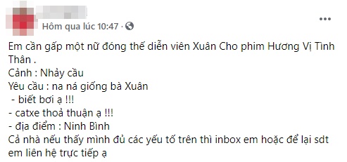 Cũng trong thời điểm đoàn phim ghi hình tại Ninh Bình, MXH còn lan truyền thông tin nhân vật bà Xuân nhảy cầu tự tử trong phim khi có một nhân vật được cho là thành viên đoàn phim đăng đàn tìm kiếm người đóng thế cho nữ diễn viên Quách Thu Phương trong cảnh nhày cầu này.