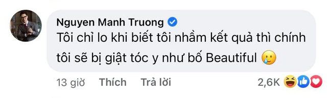 Trong khi đó, Mạnh Trường tỏ ra lo lắng cho nhân vật của mình. Anh sợ rằng "shark" Long cũng sẽ bị giật tóc y như bố Sinh nếu một ngày Nam phát hiện ra kết quả ADN bị "nhầm". Chẳng những vậy, anh chàng còn gọi bố Sinh là "bố Beautiful" khiến ai nấy cười ngất. Nhanh chóng, bình luận của nam diễn viên cũng nhận được hơn 2.000 likes vì quá "mặn mà".