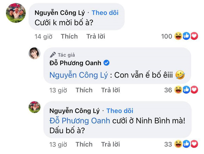 Mới đây, bên dưới bài đăng của nữ chính Hương vị tình thân - Phương Oanh, NSND Công Lý đã vào để lại bình luận gây chú ý. Theo đó, "ông Tuấn" trách "con gái" cưới mà không mời mình. Lúc Phương Oanh đáp lại là cô vẫn ế thì NSND Công Lý bình luận: "Cưới ở Ninh Bình mà? Giấu bố à?".