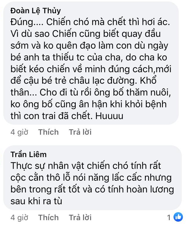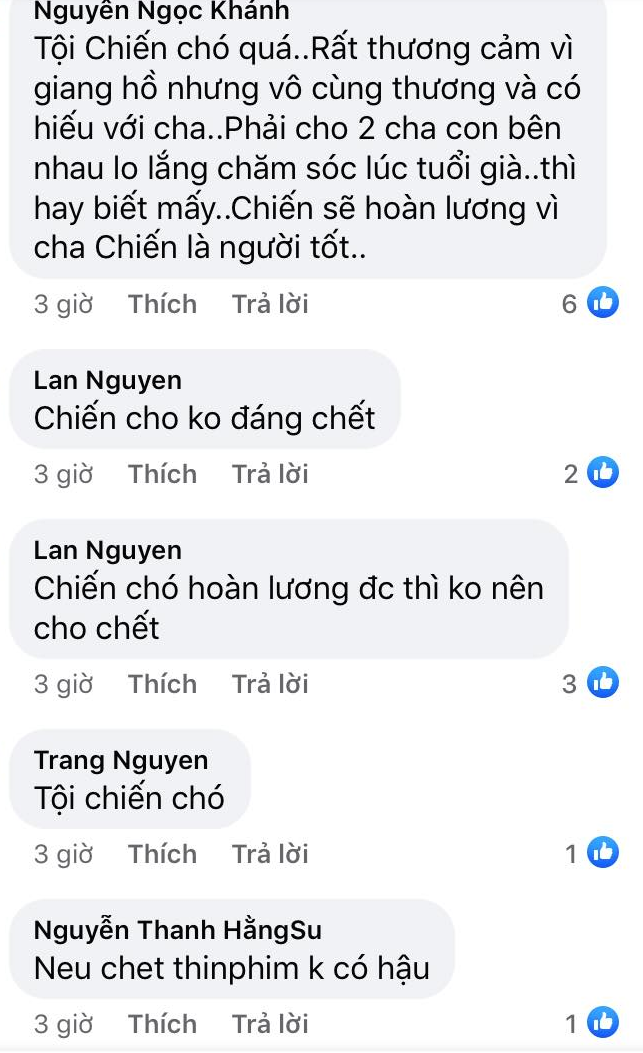 Nghi vấn Chiến 'chó' sẽ bị sát hại khiến nhiều dân mạng thương xót cho rằng nhân vật này không đáng phải nhật kết cục bi thảm như vậy. Nhiều người cho rằng Chiến 'chó' đa phải ngồi tù để trả giá cho nhiều việc làm sai trái, sau khi trở về hắn đã hoàn lương. Đặc biệt, nhiều người xúc động trước tình cảm, sự hiếu thảo mà Chiến 'chó' dành cho người cha già bệnh tật của mình. Không ít phân cảnh của hai cha con đã lấy đi nước mắt của người xem, khiến khán giả thực sự cảm nhận được hương vị của tình thân.