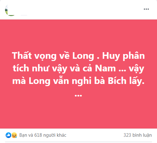 Hành động này của Long khiến nhiều khán giả thất vọng, cho rằng Long vẫn không hoàn toàn tìn tưởng Nam. Anh nghi bà Bích lấy trộm vòng vàng, rồi cũng nghi Nam dẫn mẹ vào nhà mình làm để bòn rút của cải như lời bà Xuân nói.