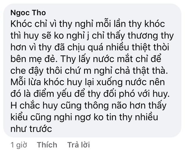 Thy cho rằng dù cố có cố gắng, nỗ lực bao nhiêu cũng vẫn không được thừa nhận xứng đáng. Thy nói từ trước đến nay mình luôn cảm thấy mọi người trong gia đình Huy chỉ coi cô là người ngoài. "Em chạnh lòng lắm. Nhiều lúc, em cảm thấy rất tủi thân. Em không biết vị trí của em trong gia đình này là gì nữa” - Thy nức nở nói với Huy.