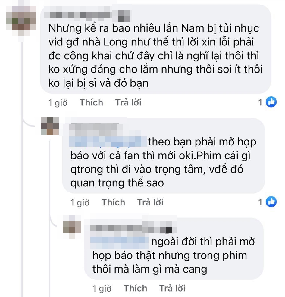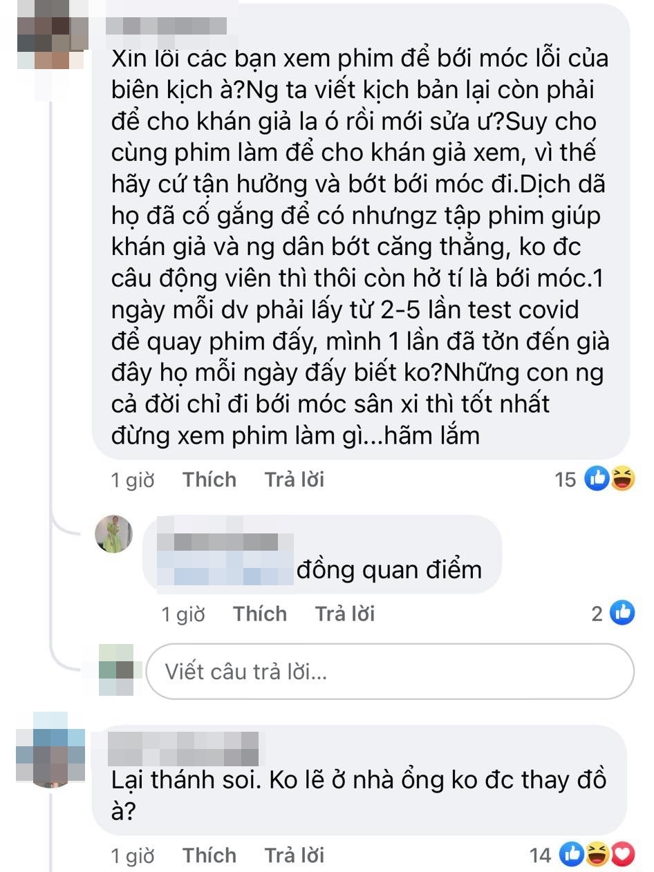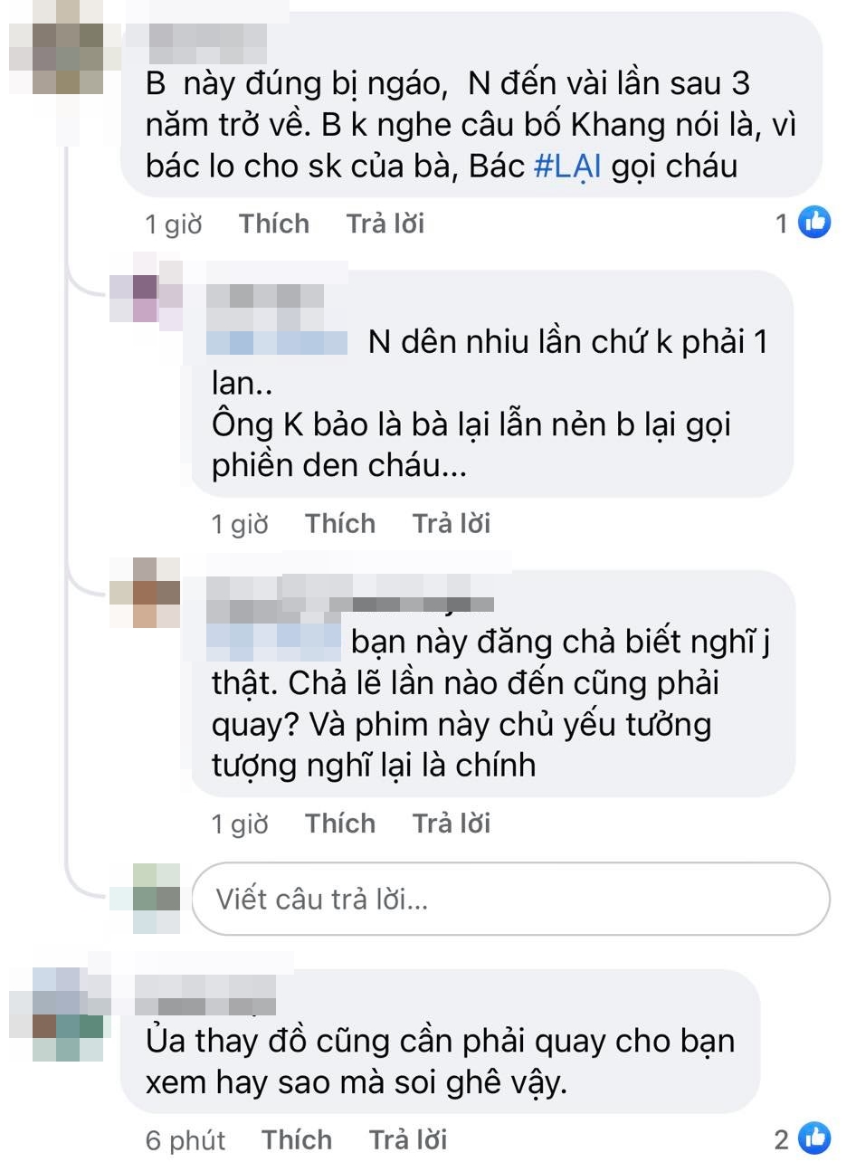 Bên dưới bài đăng của vị khán giả kia, rất nhiều fan phim đã vào bình luận. Trong đó, có một số đồng quan điểm với vị khán giả, nhưng chủ yếu lại là các bình luận... mắng ngược tác giả, cho rằng soi phim quá lố. Những người phản đối cho rằng việc ông Khang nói chuyện với Nam mặc trang phục khác chẳng có gì là bất hợp lý. Khi Nam đến chơi, ông Khang mặc đồ ngủ. Bây giờ ông thay quần áo chỉnh tề ra tiếp Nam thì có gì là sai?