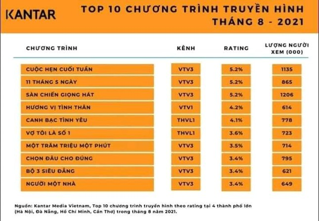 Mới đây, Kantar Medie Vietnam đã công cố top 10 chương trình truyền hình có rating cao nhất trong tháng 8/2021. Số liệu được thống kê tại 4 thành phố lớn là Hà Nội, Đà Nẵng, thành phố Hồ Chí Minh và Cần Thơ. Ngoài các chương trình gameshow đình đám, top 10 cũng có sự góp mặt của một số bộ phim truyền hình.