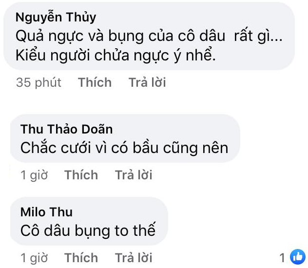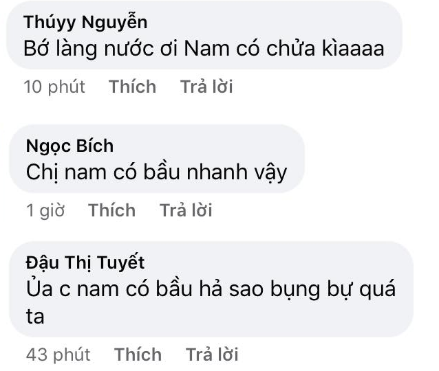 Tuy nhiên, sự quan tâm của dân mạng lại đổ dồn vào vòng eo của cô dâu. Trong lễ cưới, Nam diện chiếc đầm đuôi cá đính kế cầu kỳ gợi cảm, kiểu dáng ôm sát cơ thể, giúp cô dâu phô diễn đường cong. Tuy nhiên, khi nhìn vào vòng eo to bất thường của Nam, nhiều dân mạng dự đoán Nam đã có bầu.