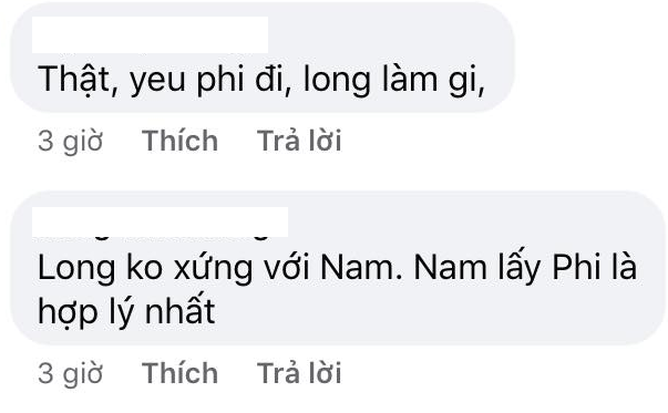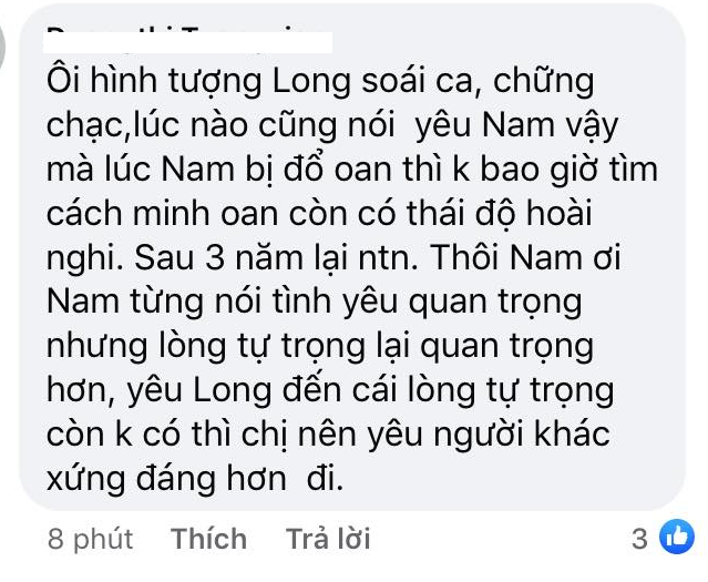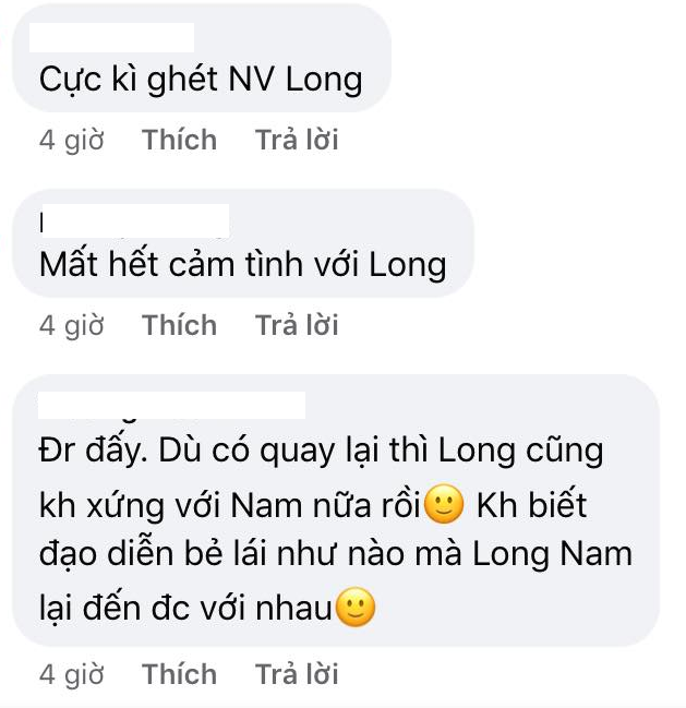 Thậm chí, nhiều khán giả đã cho tuyên bố không ủng hộ Long - Nam quay về bên nhau vì cho rằng Long không xứng đáng.