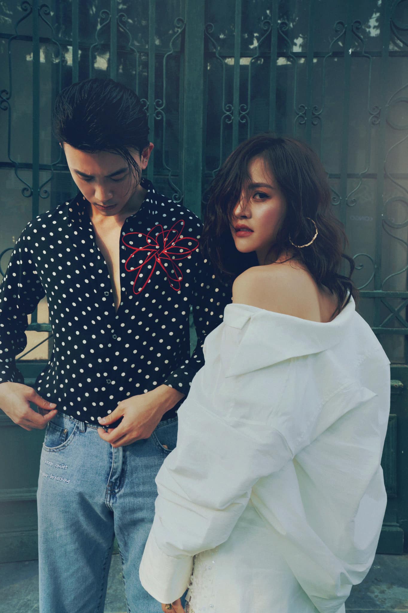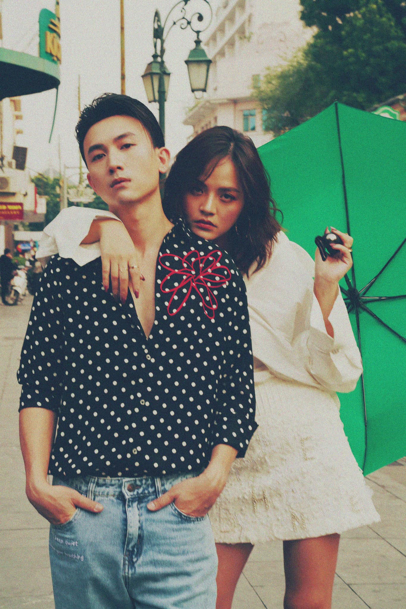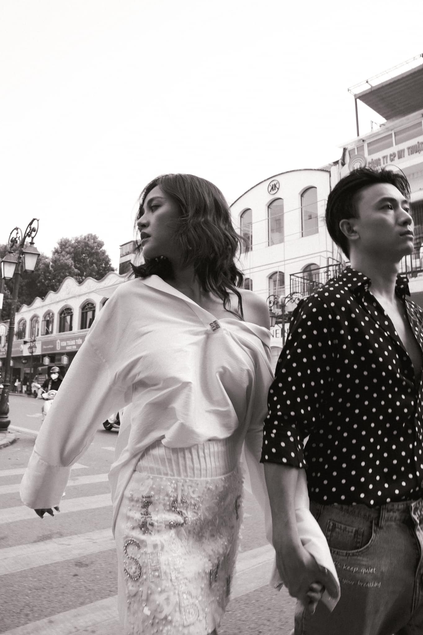 Trong bộ ảnh, Thu Quỳnh và Anh Vũ bước xuống phố với streetstyle cực ấn tượng. Không ăn diện giống nhau ở những lần lên phim nhưng vẫn nhận thấy sự đồng điệu của cặp đôi này ở nét cá tính, thời thượng và chút “bụi phủi”.