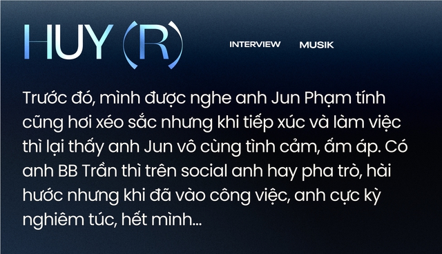 Anh Tài mà mình cảm thấy khác xa tưởng tượng phải kể đến anh Jun Phạm. Trước đó, mình được nghe anh Jun tính cũng hơi xéo sắc nhưng khi tiếp xúc và làm việc thì lại thấy anh Jun vô cùng tình cảm, ấm áp. Có anh BB Trần thì trên social anh hay pha trò, hài hước nhưng khi đã vào công việc, anh cực kỳ nghiêm túc, hết mình cho phần trình diễn của nhóm. Thỉnh thoảng, anh BB cũng trầm tính, ít nói chứ không phải lúc nào cũng hoạt náo.