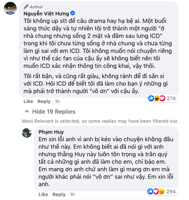 Sau khi biết được sự việc, ICD đã ngay lập tức vào chính bài đăng của Rica để gửi lời xin lỗi. Đồng thời, quán quân King Of Rap cũng khẳng định bản thân mình luôn tôn trọng và mang ơn đàn anh, mọi thông tin "vô ơn" hay chơi xấu đều hoàn toàn sai sự thật.