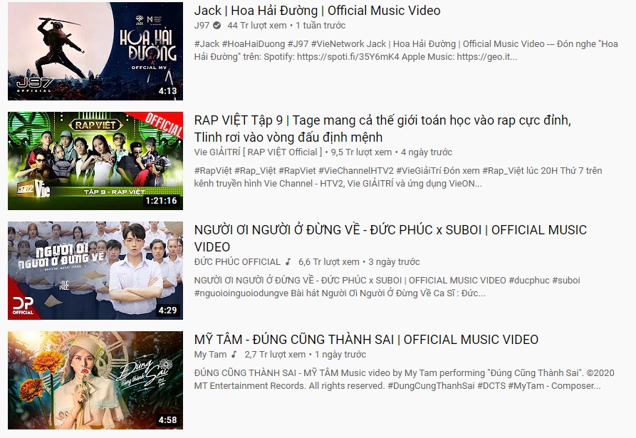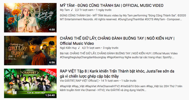 Đáng nói là tuần qua Vpop chào đón sự trở lại của nhiều giọng ca khủng như Ngô Kiến Huy và cô - trò Mỹ Tâm - Đức Phúc. Tuy nhiên, dù đã ra mắt được vài ngày nhưng MV của Đức Phúc và Mỹ Tâm vẫn chỉ lần lượt chiếm giữ vị trí #3 và #4 trên top trending Youtube. Vị trí thứ 2 thuộc về Rap Việt - gameshow âm nhạc đang rất được yêu thích hiện nay.
