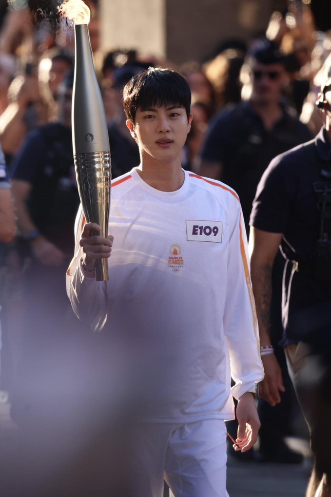 Được cảnh sát hộ tống, Jin đóng vai trò là người chạy kết nối những đoạn đường ở Paris, mang theo ngọn đuốc từ ngã tư Đại lộ Rivoli đến Kim tự tháp Louvre và chuyền cho cựu VĐV trượt tuyết Sandra Laoura. Sau khi hoàn thành màn rước đuốc kéo dài khoảng 10 phút, ca sĩ kết thúc nhiệm vụ và vẫy chào tạm biệt khán giả.