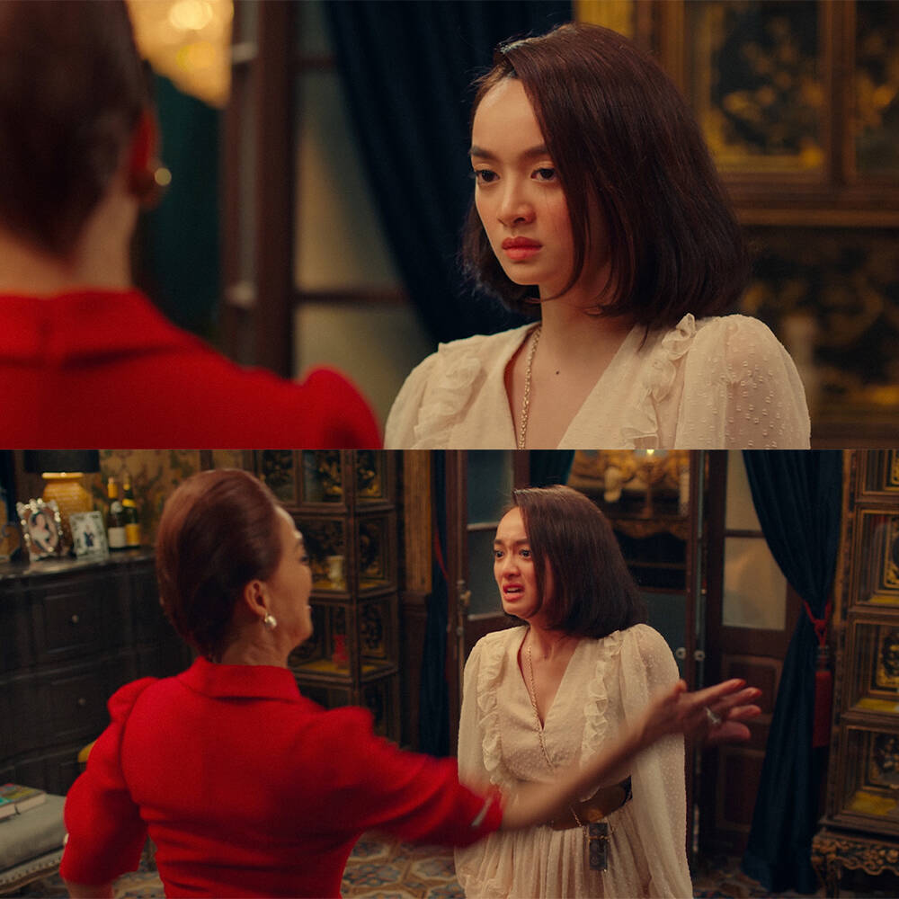 Trong cảnh này, Kaity Nguyễn đã thể hiện bộ mặt phản kháng rất dữ dội và có thể nói đây là lần đầu tiên ta thấy Kaity Nguyễn nổi giận, bộc phát, như giải tỏa những ức chế, căm hờn đúng chất một cô gái 25 tuổi. Nó khác cái cách cô chỉ rớm nước mắt rồi trôi tuột khi nghe mình đang bị hai cha con Quách Gia lợi dụng, vì suy cho cùng, họ chỉ là đang lợi dụng lẫn nhau.