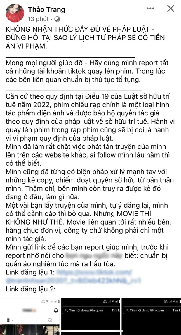 Mới đây nhất, Thảo Trang - tác giả của bộ tiểu thuyết gốc đã đăng tải một bài viết bày tỏ sự phẫn nộ trước việc đứa con tinh thần của mình bị quay lén và đăng tải tràn lan trên mạng xã hội. Cô chỉ đích danh hai tài khoản TikTok đã quay lại toàn bộ nội dung phim của mình, thậm chí còn mượn việc spoil phim để kêu gọi tăng người theo dõi. Nữ tác giả vô cùng bức xúc, cô cũng cho biết mình là một người vô cùng coi trọng vấn đề bản quyền và từng vào cuộc xử lý đích danh người "copy, chiếm đoạt" trái phép truyện của mình. Thế nên với trường hợp phim điện ảnh bị quay lén, cô sẽ không dừng lại ở việc cảnh cáo, bỏ qua vì nó "liên quan tới rất nhiều bên, hàng chục đơn vị, công ty chứ không phải chỉ một mình tác giả".