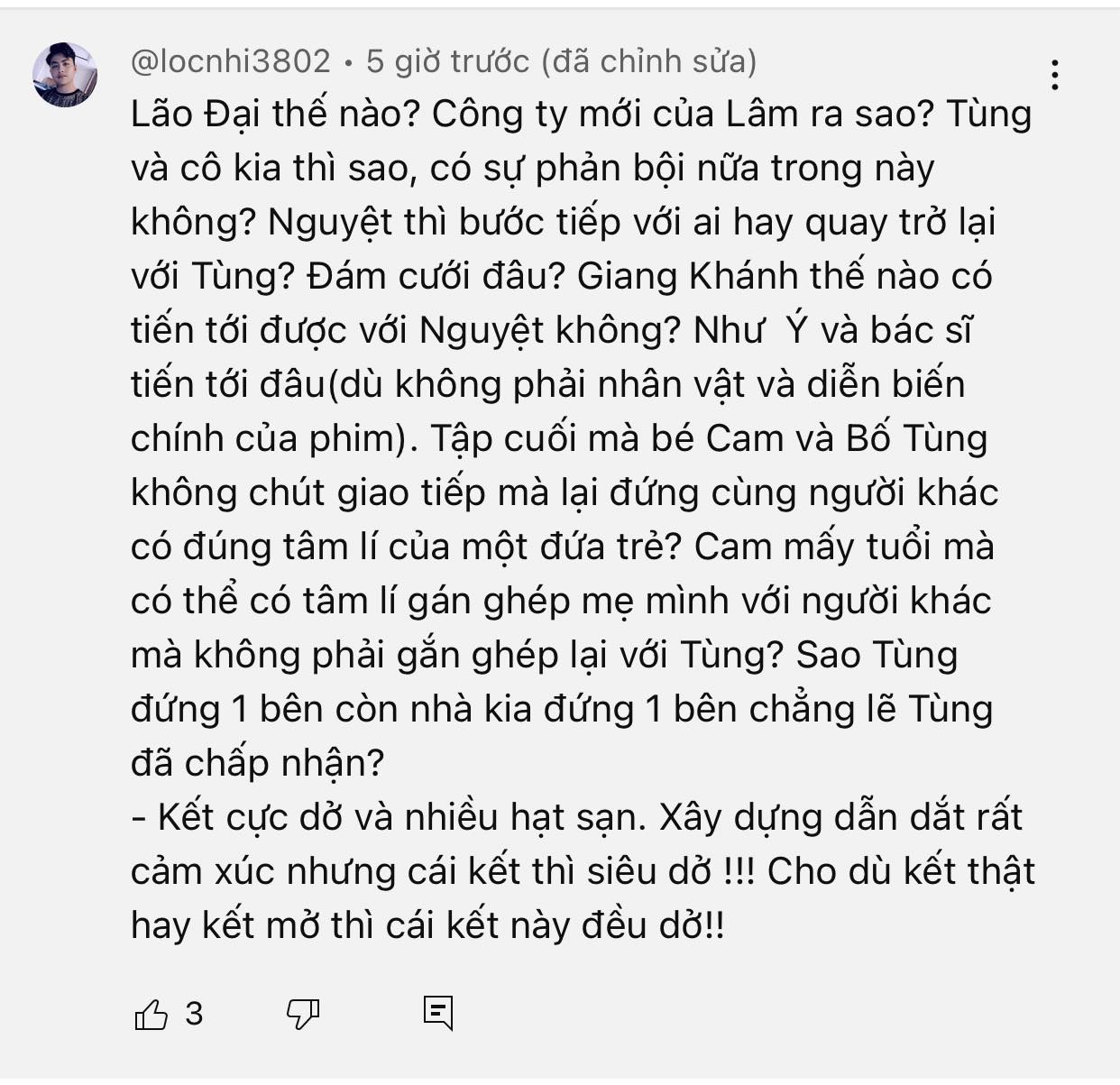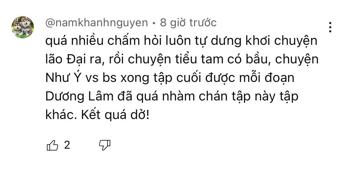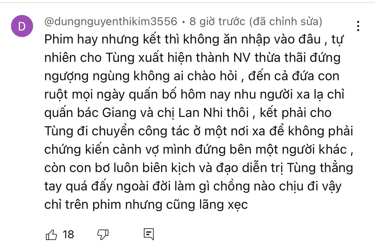 Trên MXH, rất nhiều khán giả cảm thấy không hài lòng về cái kết của phim bởi còn quá nhiều điều chưa được giải đáp như chuyện tình của Như Ý và bác sĩ Tuấn, cái kết của 'tiểu tam' Anh Thu, của lão Đại....
