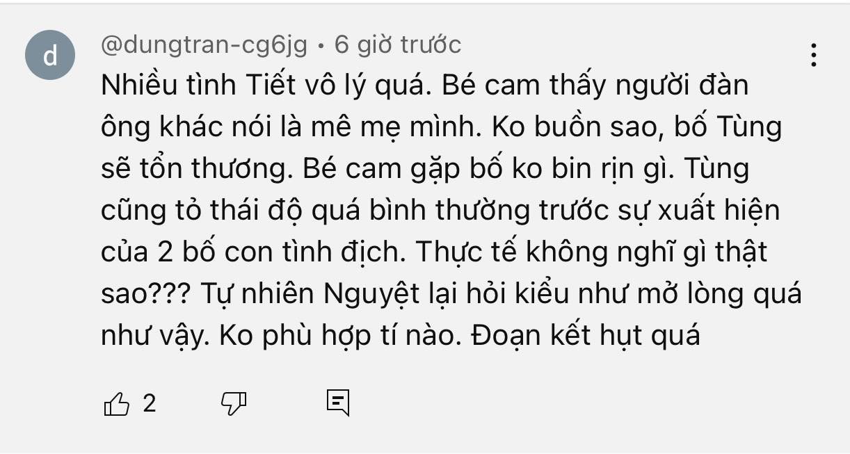 Tuy nhiên, cảnh phim này không hề quay đến cảm xúc của Nguyệt và Tùng khi gặp lại nhau, đặc biệt là cảm xúc của Tùng khi Nguyệt đang đứng bên một người đàn ông khác như một gia đình. Bé Cam cũng hờ hững với bố như người xa lạ. Cô bé chỉ quấn quýt bên chị Lan Nhi và nhiệt tình 'đẩy thuyền' mẹ và bác Giang.