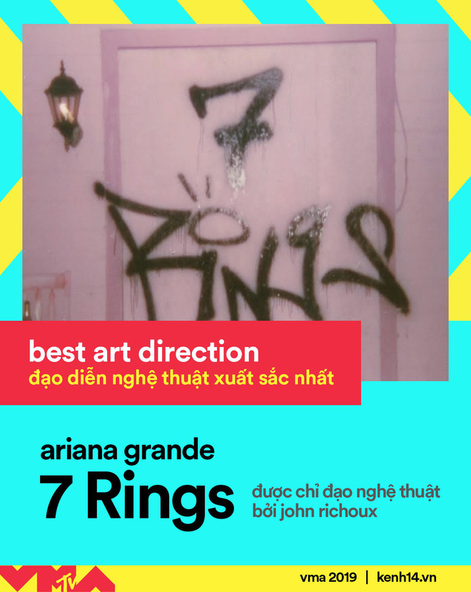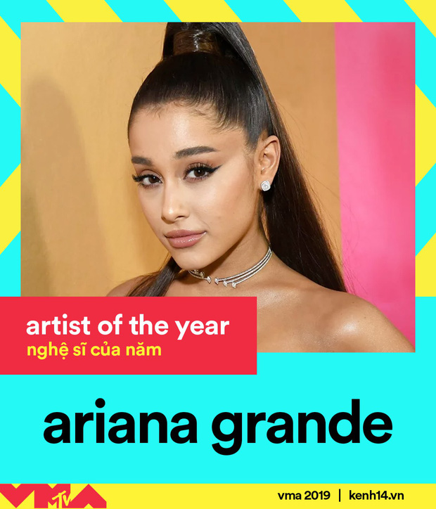 Mặc dù "cáo lui" tại VMAs năm nay nhưng Ariana Grande vẫn khá bội thu, cô nàng còn chiếm hữu một giải thưởng quan trọng là "Nghệ sĩ của năm". Có thể nói, năm 2019, Ariana Grande luôn là cái tên phủ sóng dày đặc trên bản đồ âm nhạc toàn cầu. Từ bảng xếp hạng Billboard Hot 100, doanh thu về mặt thương mại cho đến những kỷ lục âm nhạc đều có sự góp mặt của chủ nhân hit "Side To Side". Ngoài giải thưởng trên, Ariana Grande còn chiến thắng ở các hạng mục như "Song Of The Summer" – "Ca khúc hay nhất mùa hè", "Best Art Direction" – "Đạo diễn Nghệ thuật xuất sắc nhất",…