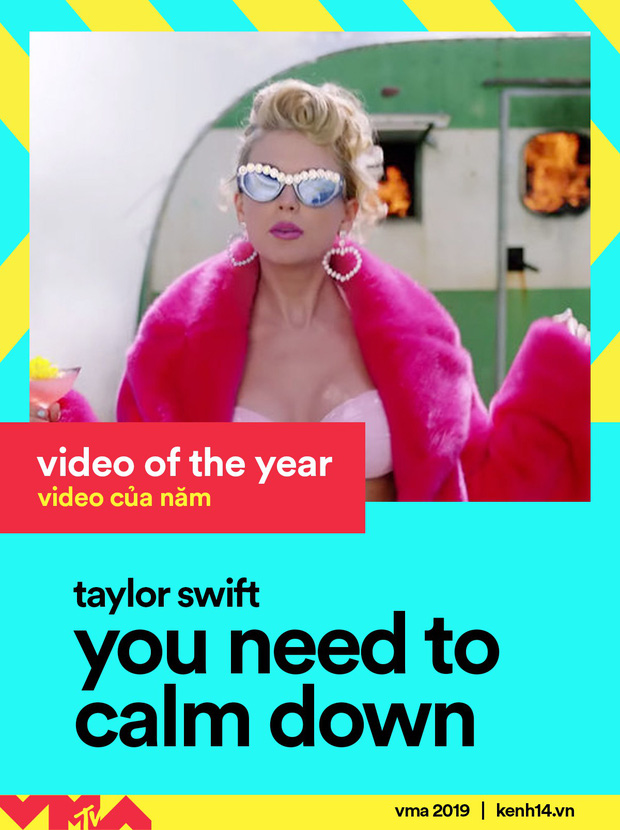 Cụ thể, MV "You Need To Calm Down" chính thức vượt qua hàng loạt đối thủ nặng ký như "thank u, next" của Ariana Grande, "Old Town Road" của Lil Nas X - Billy Ray Cyrus, "Sucker" của Jonas Brothers,… xuất sắc giành lấy chiếc cúp danh giá nhất "Video của năm". Như vậy, suốt một thập kỷ qua, Taylor Swift là nghệ sĩ duy nhất có đến hai lần chạm tay vào giải thưởng này. Trước đó, bom tấn cực khủng "Bad Blood" cũng giúp chủ nhân hit "Shake It Off" lần đầu chiến thắng hạng mục "Video của năm" tại lễ trao giải MTV Video Music Awards 2015.