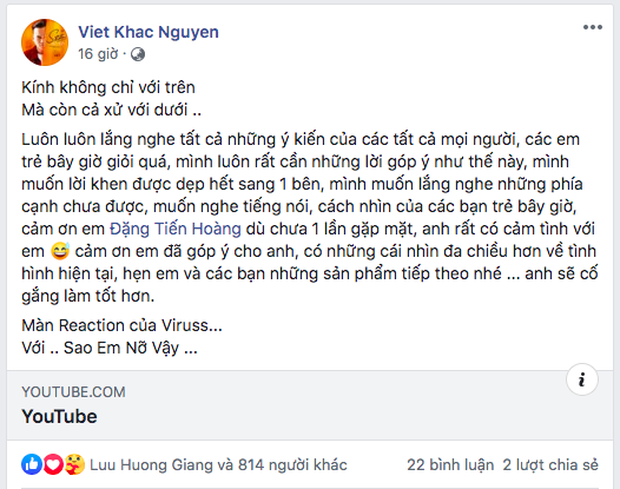 Điều khiến khán giả bất ngờ là ngay sau đó không lâu, 'chính chủ' Khắc Việt đã lên tiếng cảm ơn ViruSs về những góp ý thẳng thắn của anh chàng. Bên cạnh đó, Khắc Việt cũng hứa hẹn sẽ làm tốt hơn ở những sản phẩm tiếp thep. Vì là đàn anh nên hành động cho thấy sự khiêm tốn này của Khắc Việt được khán giả đánh giá cao.