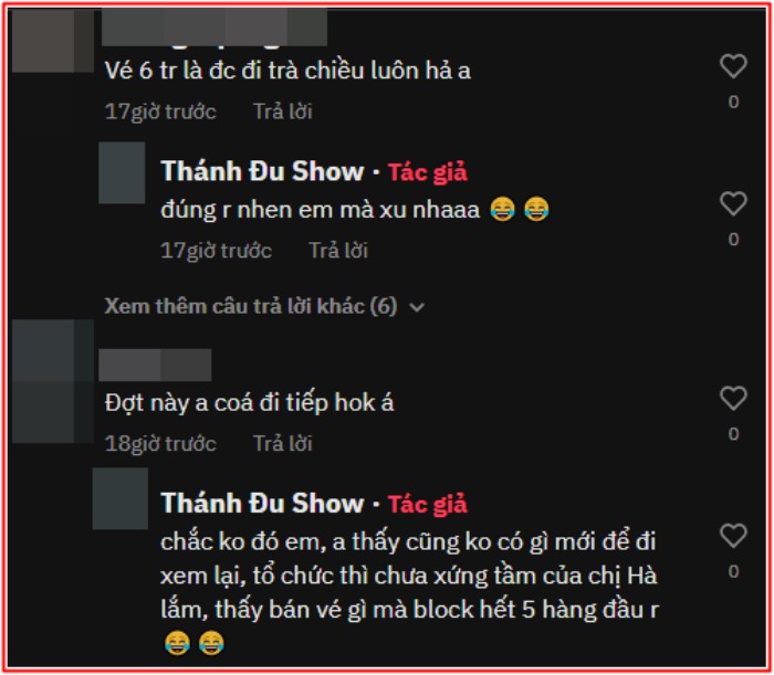 Khi được dân mạng hỏi sẽ tiếp tục mua vé xem show Hồ Ngọc Hà tại Đà Nẵng không, khán giả này cho biết: "Chắc không đó em, anh thấy cũng không có gì mới để đi xem lại, tổ chức thì chưa xứng tầm của chị Hà lắm, thấy bán vé gì mà block hết 5 hàng đầu".