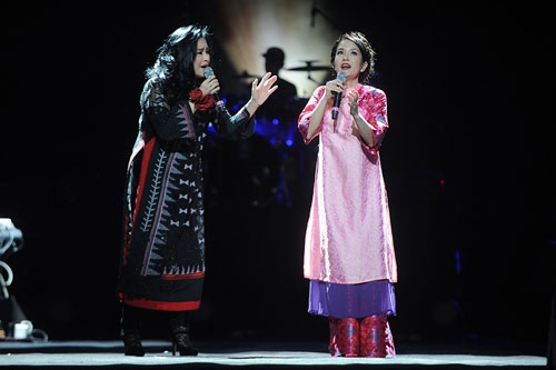 Hồng Nhung và Thanh Lam thể hiện liên khúc "Người ở đừng về" và "Bèo dạt mây trôi" trên sân khấu. |