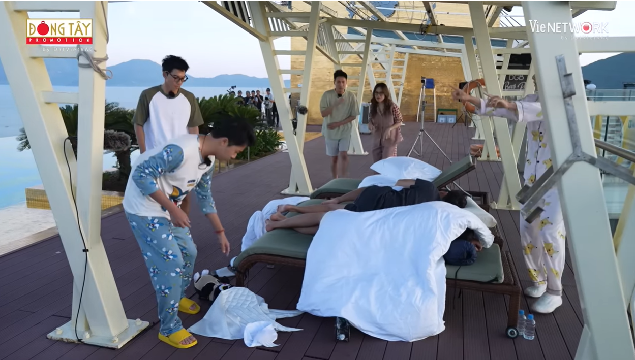 Kiều Minh Tuấn muốn Mỹ Tâm gọi Trường Giang và Bảo Lâm dậy theo cách nào đó thật ấn tượng. Mỹ Tâm gợi ý tạt nước nhưng các thành viên khác lại chốt phương án quăng hai thành viên thua cuộc này xuống bể bơi.