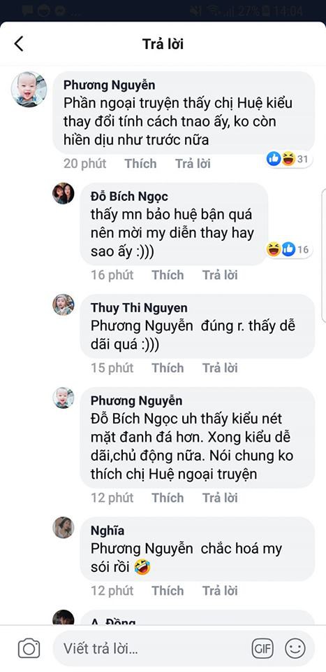Bình luận này nhanh chóng nhận được nhiều sự đồng cảm từ khán giả theo dõi bộ phim. Không ít khán giả đã bày tỏ rằng họ không còn thích Huệ nữa vì sự thay đổi này.