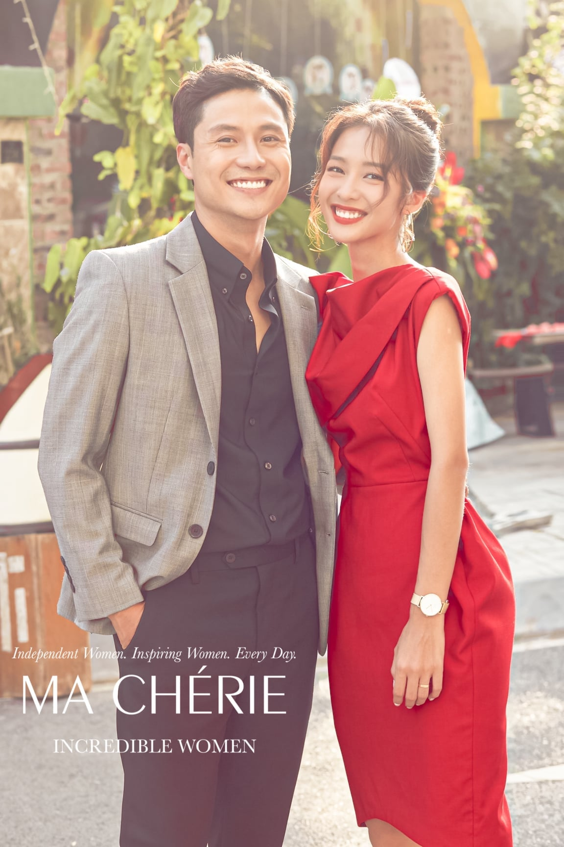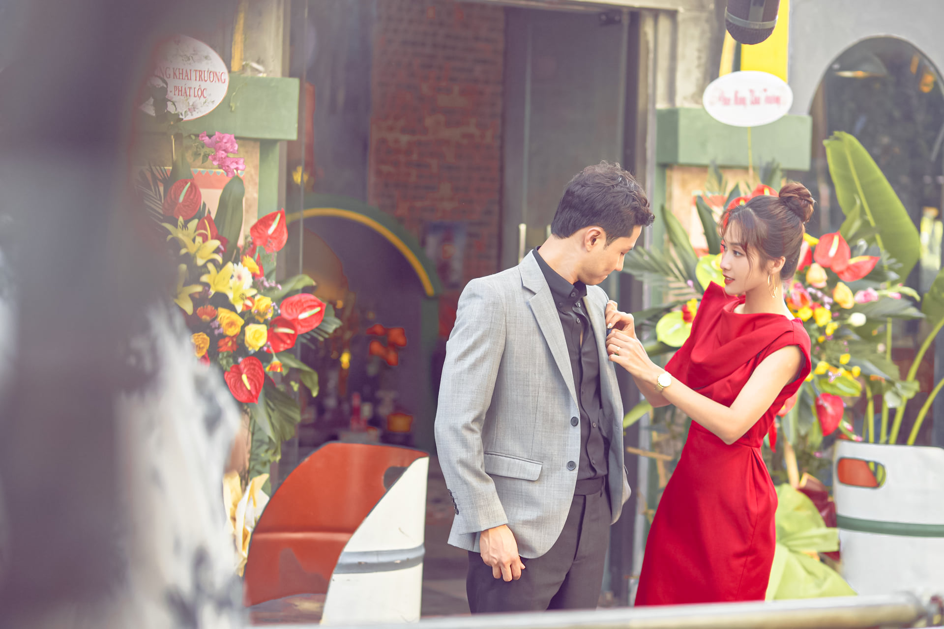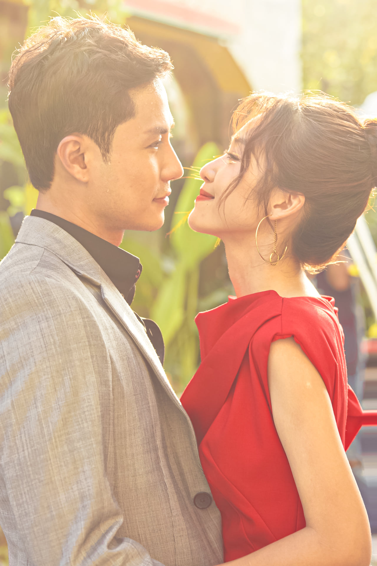 Tạo hình của cặp đôi trong cảnh phim này cũng nhận được nhiều lời khen ngợi từ dân mạng. Tuệ Nhi diện chiếc đầm đỏ rực rỡ khoe vòng eo con kiến, mái tóc búi cao tôn lên nét quyến rũ nhưng không kém phần trẻ trung.