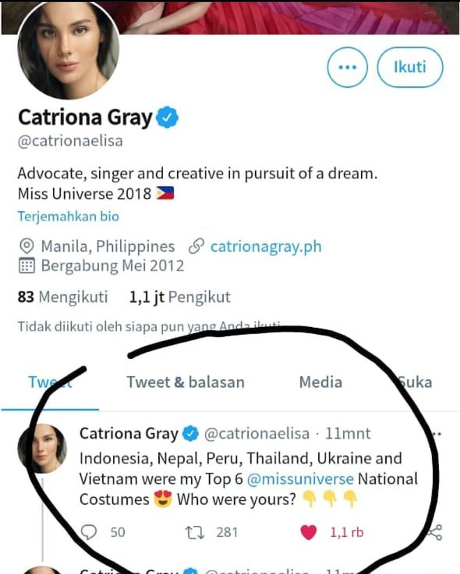 Trên Twitter, Hoa hậu Hoàn vũ Thế giới 2018 Catriona Gray cũng cho rằng Kén Em sẽ lọt Top 6 trang phục dân tộc đẹp nhất của Miss Universe 2020 cùng các đại diện đến từ Indonesia, Nepal, Peru, Thái Lan và Ukraine.