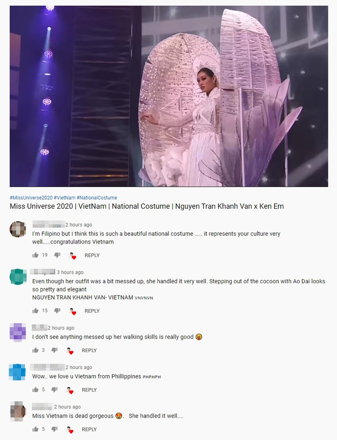 Một khán giả Philippines bình luận: "Tôi là người Philippines nhưng tôi nghĩ đây là một bộ trang phục dân tộc quá đẹp, nó thể hiện đúng nét văn hóa của đất nước các bạn... Xin chúc mừng Việt Nam".