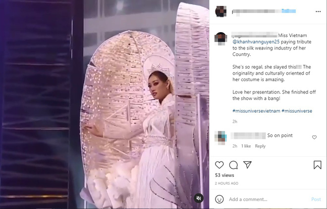 "Hoa hậu Việt Nam mặc trang phục này để tri ân nghề dệt lụa của đất nước mình. Cô ấy thật sang trọng và tỏa sáng! Sự độc đáo và đậm đà bản sắc dân tộc trong trang phục của cô ấy rất ấn tượng. Tôi thích phần trình diễn này. Màn khép lại chương trình của cô ấy thật bùng nổ!", một netizen quốc tế khác cũng bày tỏ.