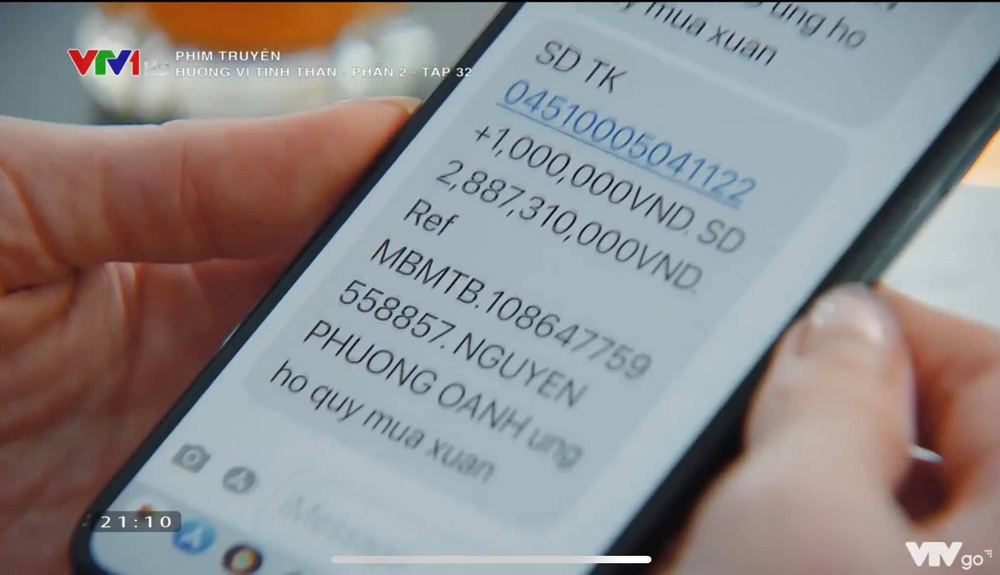 Bên cạnh đó, ở cảnh quay thể hiện tin nhắn báo số dư tài khoản các nội dung chuyển khoản của các mạnh thường quân gửi bà Xuân, khán giả cũng phát hiện ra một cái tên quen thuộc. Đó chính là tên của Phương Oanh - nữ diễn viên đảm nhiệm vai chính của bộ phim.