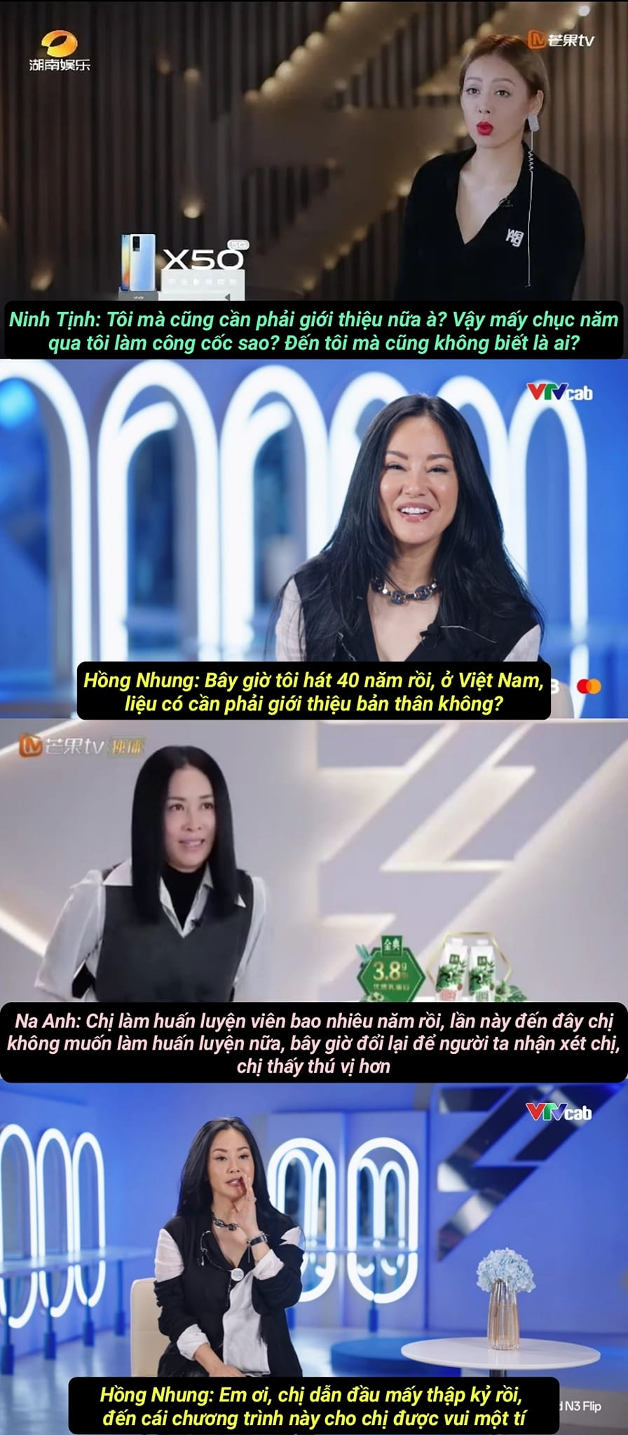 Trong khi đó, khán giả so sánh màn "flex" của Hồng Nhung với câu mở đầu của Ninh Tịnh trong chương trình Tỷ Tỷ Đạp Gió Rẽ Sóng bản Trung. Khi mới tham gia mùa đầu tiên, Ninh Tịnh cũng có phát ngôn gây sốc không kém: "Tôi mà cũng cần giới thiệu nữa à? Vậy mấy chục năm qua tôi làm công cốc sao? Đến tôi mà cũng không biết là ai?"